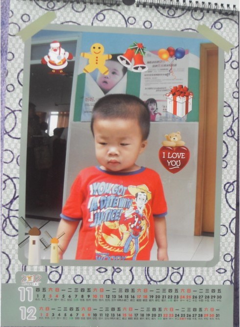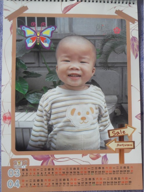 寶寶最初看到掛歷的時候,非常的開心,一下就發(fā)現(xiàn)了自己的倩影,指著照片說,寶寶,寶寶,有別的小朋友想看的時候,他不干,過來扯,覺得是自己的東西。后來我又給寶寶看掛歷上的掛飾,寶寶認識不少呢,笑聲不斷的爆發(fā)出來,老公也對掛歷非常的滿意,用那張4格顯眼的紅照片,掛在墻壁上,為暗淡的屋子增添了很多色彩呢。