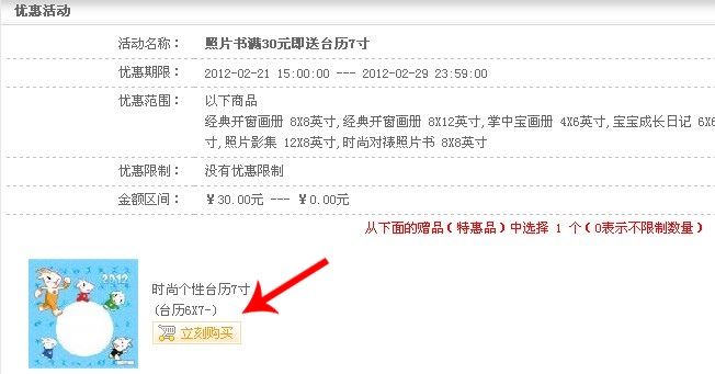 3、制作完照片書后請勿急于下單,繼續(xù)制作時尚個性臺歷7寸,制作完成后即可對照片書進行下單,然后在優(yōu)惠活動中對剛剛制作好的臺歷7寸選擇立刻購買(如下圖),即可0元得臺歷!