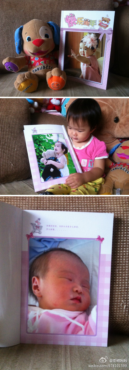 相冊收到了,質(zhì)量非常好、色彩也很鮮艷。最樂的是思思小妞拿到相冊后,指著自己剛出生的那張照片,“妹妹”“妹妹”的叫個不停!