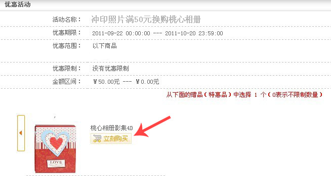 3、上傳照片后放入購(gòu)物車(chē),在優(yōu)惠活動(dòng)中選擇立刻購(gòu)買(mǎi)(如下圖),即可5元得相冊(cè)!