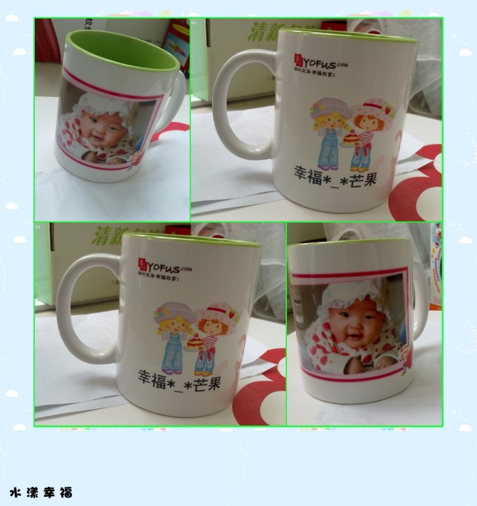 從別人博客里看到了有福網(wǎng)http://www.bridgetiger.com, 這個(gè)對(duì)于照相狂人的我來說,真是個(gè)好地方,沖洗照片很方便,各種各樣個(gè)性產(chǎn)品都可diy,那天閑著無聊給寶貝隨手設(shè)計(jì)了這個(gè)杯子,今天寄回來還覺得真不錯(cuò)呢。。。杯子質(zhì)地比較光滑,畫畫也很可愛,是個(gè)不錯(cuò)的紀(jì)念品,保準(zhǔn)是世界上獨(dú)一無二的杯子呢...此外,這個(gè)網(wǎng)站寫日志送照片書的活動(dòng)非常吸引我,一定要精心給孩子做一套照片書,好好參加這次活動(dòng)....