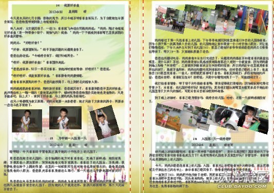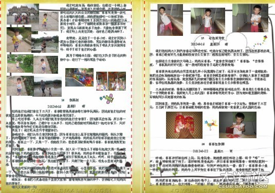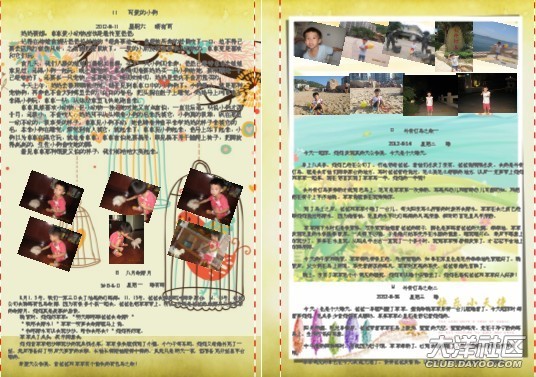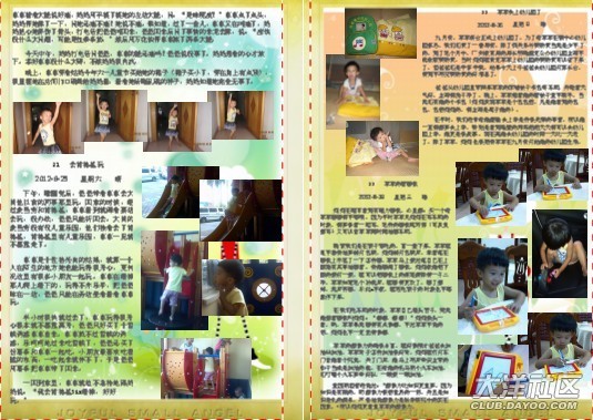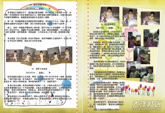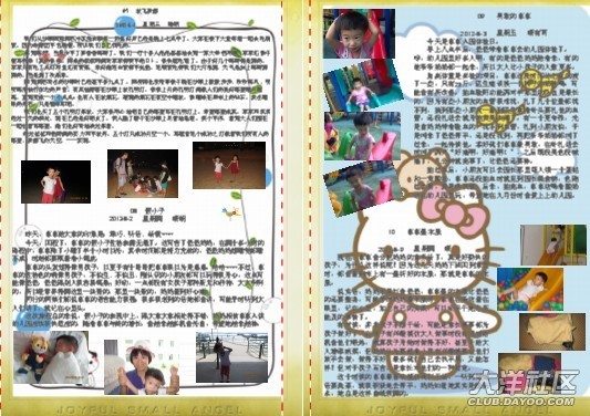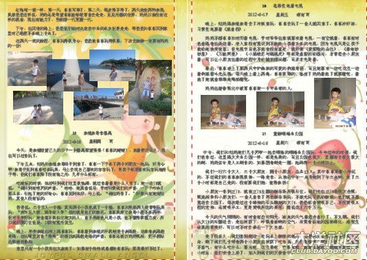 一開始做時,媽媽幾乎是一頁一篇日記,在做了10頁后,媽媽發(fā)現(xiàn)其實(shí)可以把內(nèi)容安排得更緊密些,只要把相片弄小一些,那樣就可以放更多的日記進(jìn)去。這時另外一個想法躍入腦海里,不如找些可愛的圖片做背景??墒且业胶每吹膱D片并不容易,媽媽花了很多時間去找圖片。