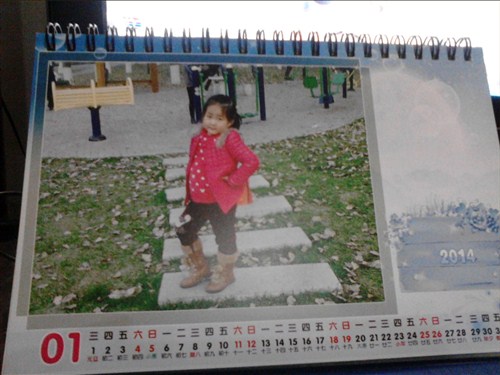 我趕緊掏出手機(jī),“咔、咔”拍了幾張后,打開(kāi)了包裝紙,熟悉的底色---藍(lán)色馬上映入眼簾,跟去年的一樣,一直以來(lái),還是特別的喜歡有福網(wǎng),因?yàn)樗麄兊闹谱魉较喈?dāng)?shù)母?,照片效果及顏色都特別的好。這種八寸雙面臺(tái)歷采用的是雙面印刷的,正面是大圖設(shè)計(jì),美觀又直觀大方,反面是大日歷小圖設(shè)計(jì),方便查看日期,它的頁(yè)數(shù)一其是12張(24頁(yè)),紙張是250G銅版紙,制作工藝是惠普Indigo印刷,裝訂方式也很特別,是采用可折疊紙板底座,YO圈裝訂,精致又牢固的同時(shí),也特別的容易方便翻頁(yè)。說(shuō)了這么多,還是來(lái)看看我用美圖制作的臺(tái)歷照片吧!