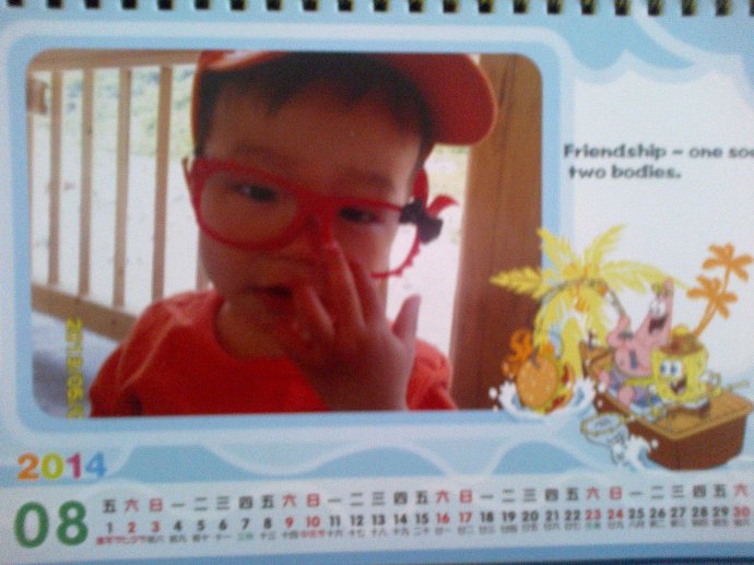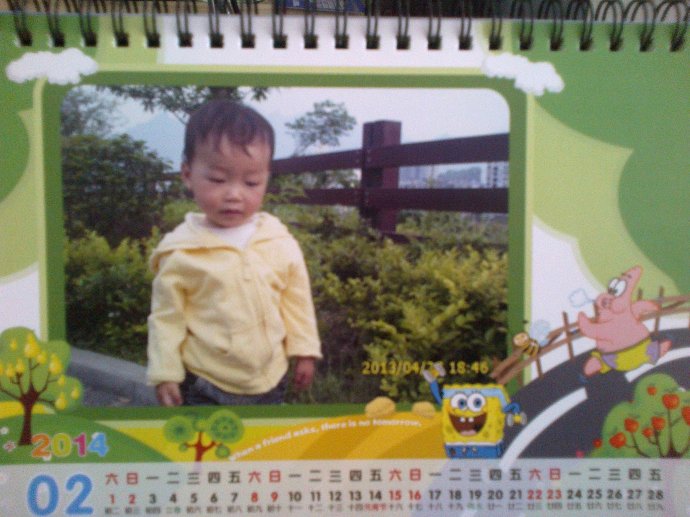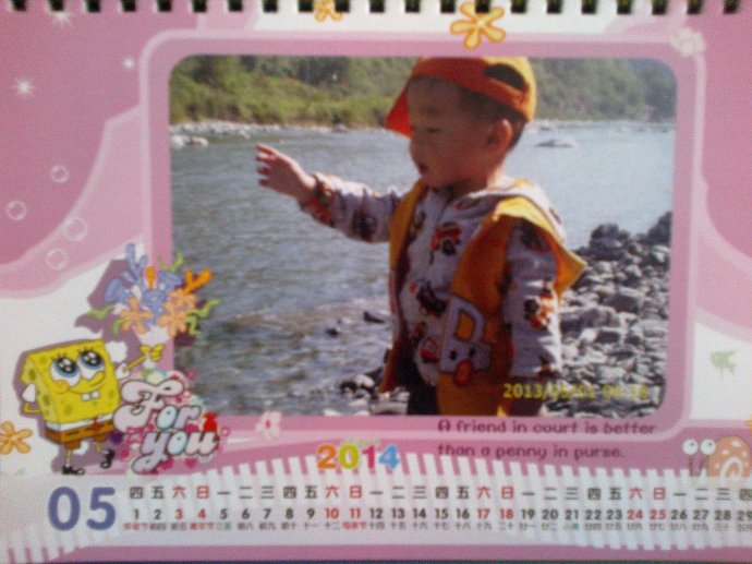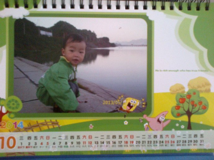 我制作這本臺歷時,在選模版的問題上糾結(jié)了好半天拿不定主意,因?yàn)槎继每戳?,于是我將自己最終選好的兩個模版都制作了一遍。將先前挑選好的照片上傳、簡單的修飾、保存在我的作品欄里。決定等兒子午睡醒后,讓他自己來選一個,他毫不猶豫地選了《海綿寶寶》這個模版,理由是:和我書包上海綿寶寶一模一樣,我好喜歡海綿寶寶呀!