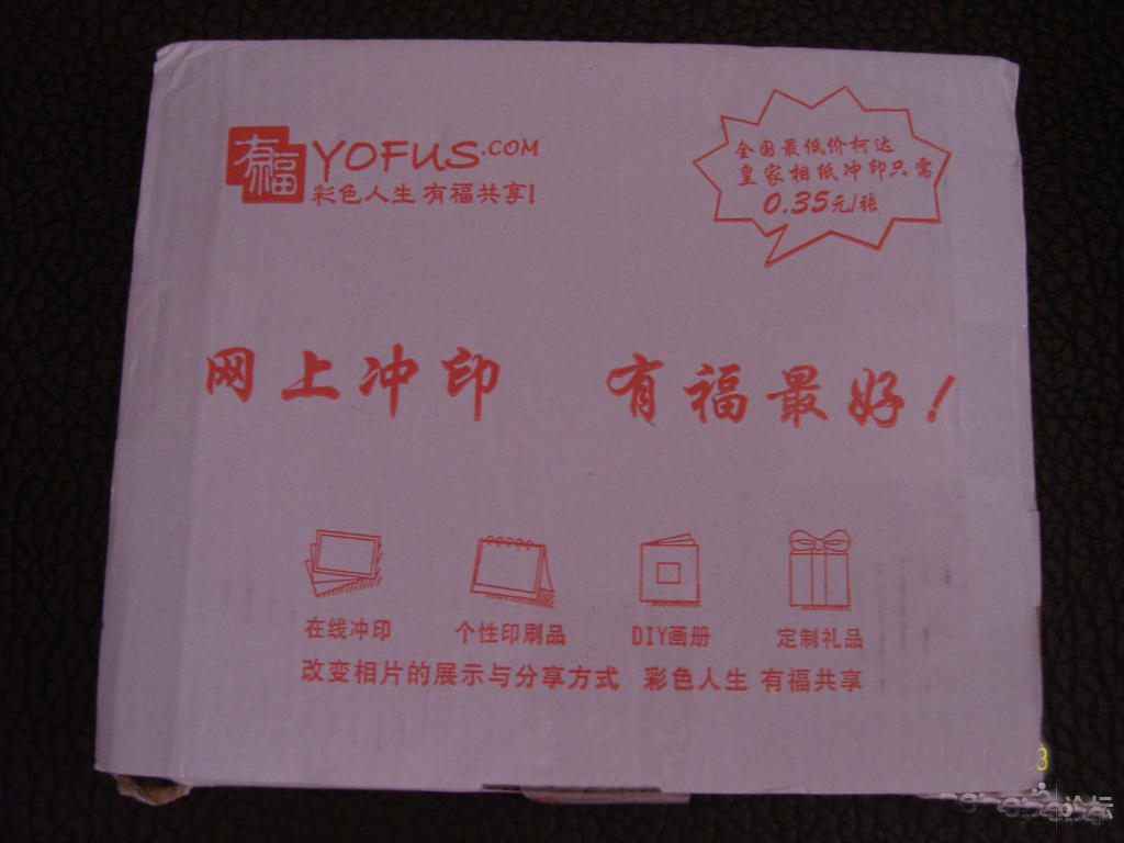 這是相冊(cè)的外包裝,防止相冊(cè)在運(yùn)輸過程中被擠壓損壞的,這上面有有福的一些介紹,最讓我心動(dòng)的是右上角的那個(gè)框框里的內(nèi)容:一張相片沖印只要0.35元,想想以前我在專門的照相館里沖印一張要1元呢,下次知道了,如果要洗照片的話就選有福了--物美價(jià)廉!