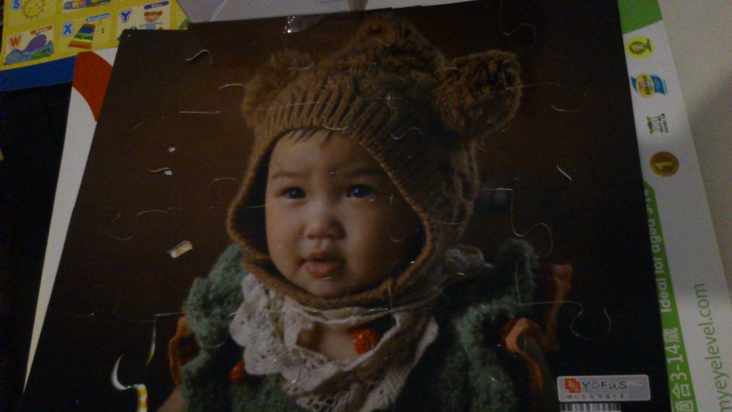 這么有趣的照片,單一張有點(diǎn)簡(jiǎn)單了。最近在有福網(wǎng)上發(fā)現(xiàn)更加有趣的東西,就是個(gè)性拼圖,二十塊小小的木塊,能拼出這Q孩子模樣。給她自己玩,也是件有趣事情。媽媽還拼好,裱起來,她在旁邊還搗亂。裱好拼圖時(shí)候,放在她面前,她那天生呆萌表情又出來。