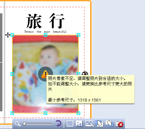 添加相片時我有點疑問,就是同樣都是單反相機拍出來的相片可當你添加到頁面里的時候,它會提示你說相片的像素不足,請調整到合適的大小,如果不能調整請更換像素合適的相片。遇到 好幾張這樣的相片,讓我很遺憾的沒有把想如冊的放到相片書里面去。不知道其他的親們在制作的過程中遇到過類似的問題沒有呢?