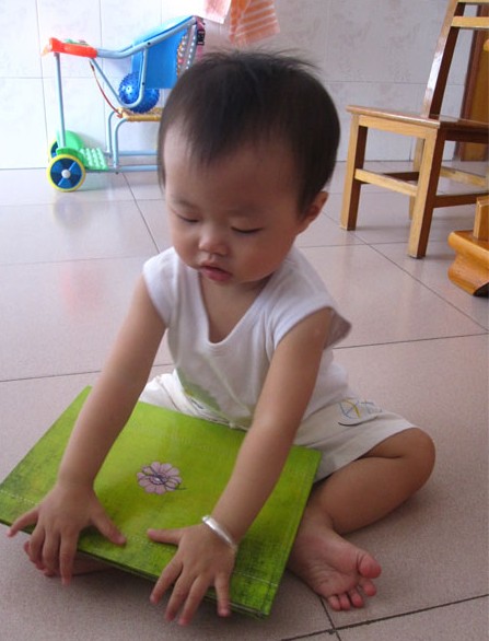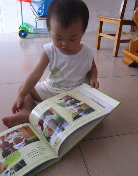 小家伙一邊看照片一邊笑呢,看完一頁(yè)也會(huì)自己翻開(kāi)看下一頁(yè),有時(shí)候還指著自己的相片在那自得其樂(lè)呢,看來(lái)小寶寶的世界也很精彩的。