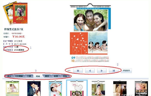 3、進入之后,可以看到此類掛歷的介紹,1區(qū)域包括裝訂方式以及紙張,原來我做過印刷所以我知道250G銅版紙可是相當(dāng)厚的喲。然后可以在2區(qū)域選擇自己喜歡的模版,點擊一個就可以在右上方看到相應(yīng)模版的預(yù)覽。在3區(qū)域可以查看內(nèi)頁的照片布局情況。待選定了自己喜歡的,那么就可以開始制作了喲。