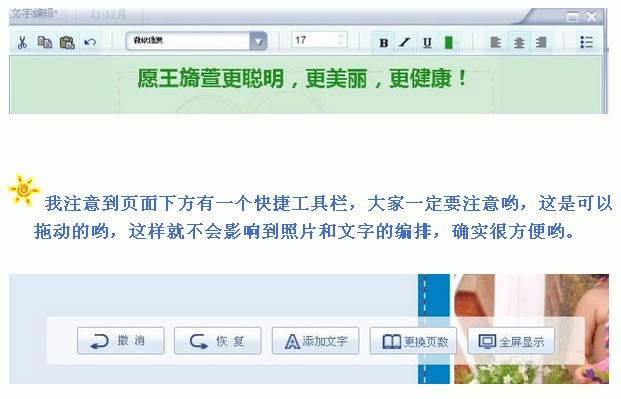 8、我注意到頁面下方有一個快捷工具欄,大家一定要注意喲,這是可以拖動的喲,這樣就不會影響到照片和文字的編排,確實很方便喲。