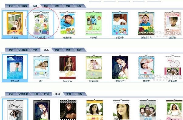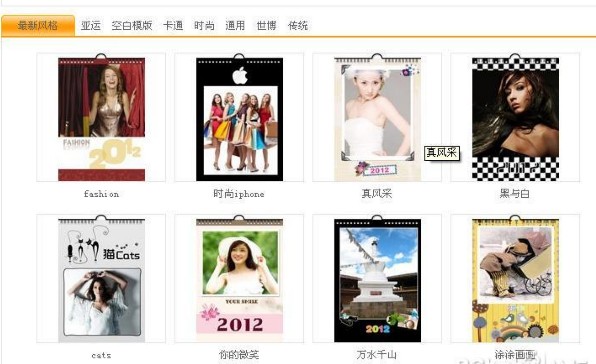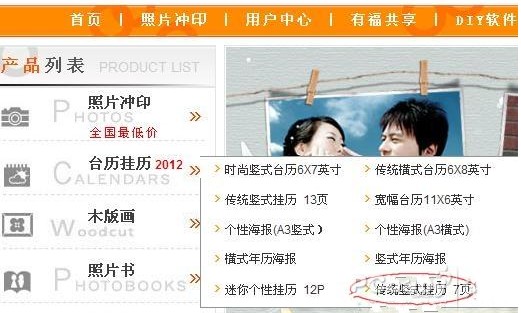 3、因?yàn)槲覀冞@次所要做的是掛歷,所以我們可以到左側(cè)豎欄找到“臺(tái)歷掛歷”,至于這個(gè)2012,我想是每年都變得吧,相信明年一定是變成2013了,呵呵。這次咱們體驗(yàn)的是7頁(yè)的傳統(tǒng)豎式掛歷,大家可別選錯(cuò)喲!