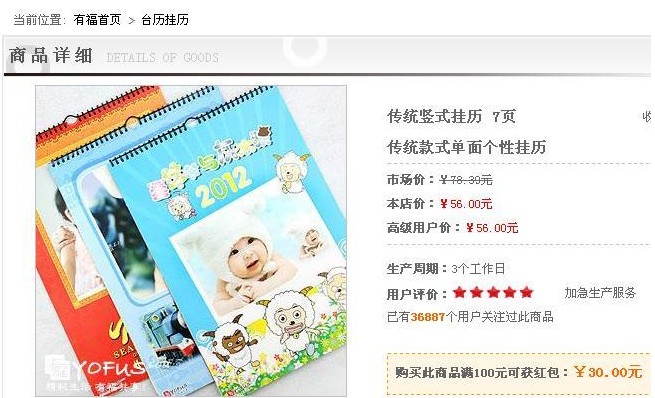 4、選對(duì)掛歷點(diǎn)進(jìn)去,我們就可以來(lái)瀏覽這款掛歷的詳細(xì)信息了。呵呵,我們可以看到,這款產(chǎn)品正在促銷(xiāo)呢。只要買(mǎi)滿100元就可以獲得30元紅包喲!