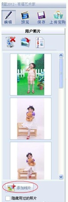 上傳好的照片就顯示在軟件的左側(cè)欄里了。如果覺(jué)得照片不滿意還可以刪除替換等等。如果排列順序不是你想要的位置,頁(yè)數(shù)可以移動(dòng)的。如果照片不夠,還可以添加照片。