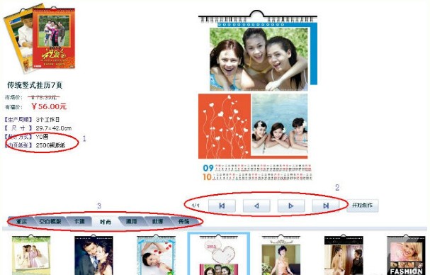 進(jìn)入之后,可以看到此類掛歷的介紹,1區(qū)域包括裝訂方式以及紙張,原來(lái)我做過(guò)印刷所以我知道250G銅版紙可是相當(dāng)厚的喲。