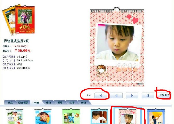 選擇豎式掛歷后預(yù)覽只會(huì)顯示4頁,不是說7頁么?先別著急,點(diǎn)擊開始制作后就會(huì)變成7頁啦!這時(shí)候就會(huì)導(dǎo)入事先選好的相片,根據(jù)你選的模式自動(dòng)導(dǎo)入相對(duì)應(yīng)照片數(shù)量,這樣很省時(shí)間也很方便,所以媽媽們在選相片的時(shí)候最好把精華的都選出來了!